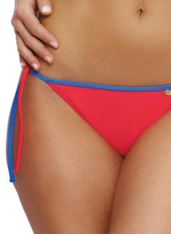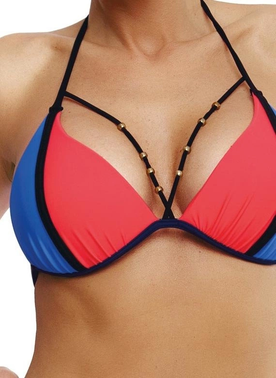 Gładkie miseczki z kontrastową, czarną lamówką są usztywniane, bez push-up-a, dobrze zbierają i usztywniają piersi jednocześnie przybliżając je ku sobie. Dekolt dopełniają dwa, ozdobne paski wykończone maleńką biżuterią. Kuszące figi, typu niskie biodrówki to bardzo kobieca propozycja na plażę. Włoska tkanina. Skład: 80% poliamid, 20% elastan.