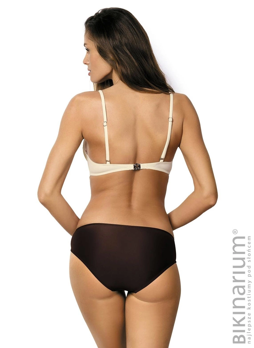 Kostium jest gładki, nieco sportowy i po prostu ponadczasowy. Biustonosz otulono miękką tkaniną, lekko szczypaną w dolnej części, co daje fajny efekt. Kolor od razu wpada w oko. Miseczki są usztywniane, wzmocnione fiszbinami (dolnymi i bocznymi), perfekcyjnie modelują piersi. Rozmiary S, M, L posiadają wypełnienie push up, które seksownie unoszą i powiększają piersi dając efekt "wow". Ramiączka o regulowanej długości, obwód elastyczny, zapinany na klamerkę.