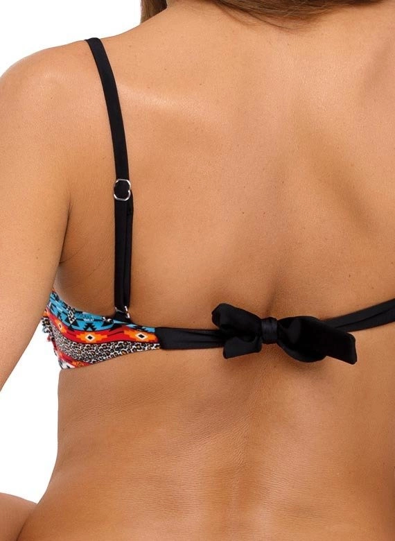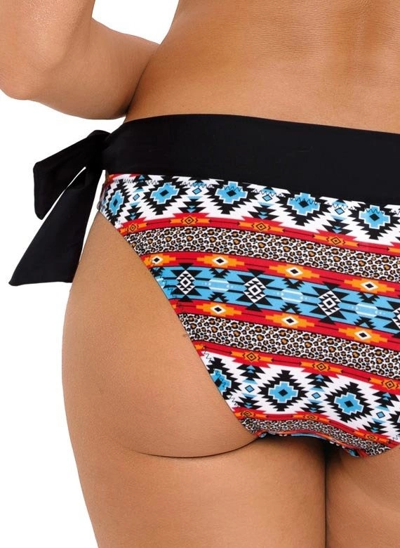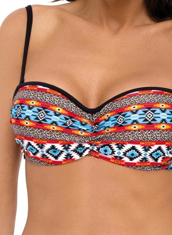 W tym wydaniu kostium jest dwuczęściowy, barwny i bardzo sexy. Biustonosz posiada usztywniane miseczki z fiszbinami oraz push-up-em, a swym krojem przypomina znaną i lubianą bardotkę. Umiejętnie zbiera i unosi piersi, optycznie je powiększając. Push-up występuje w każdym rozmiarze kostiumu i nie jest wyjmowany z modelu. Ramiączka z możliwością całkowitego wypięcia z modelu. Obwód wiązany na plecach, pozwoli Ci idealnie dopasować kostium do siebie. Majteczki z ozdobnym przewiązaniem na biodrze, o klasycznym, wkładanym, bardzo wygodnym kroju. Skład: 80% poliamid, 20% elastan.