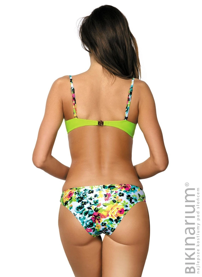 Biustonosz jest o konstrukcji bardotki, gładki, zwieńczony złotą broszką. Wyjątkowo pięknie układa się na ciele. Konstrukcja umożliwia zmysłowe uniesienie biustu, przybliżenie piersi ku sobie i optyczne ich powiększenie. Miseczki usztywniane, wzmocnione fiszbinami (dolnymi i bocznymi), świetnie modelują piersi. Rozmiary S, M, L, XL posiadają dołączone do zestawu poduszeczki push up. Włóż je do biustonosza, a Twoje piersi dodatkowo powiększą się o ponad rozmiar. Biustonosz jest zapinany na plecach na klamerkę. Ramiączka o regulowanej długości, z możliwością ich całkowitego odpięcia. Figi kwieciste, klasyczne. Tkanina elastyczna, na podszewce. Kolory wspaniale dobrane do siebie. Całość prezentuje się bardzo kobieco.
