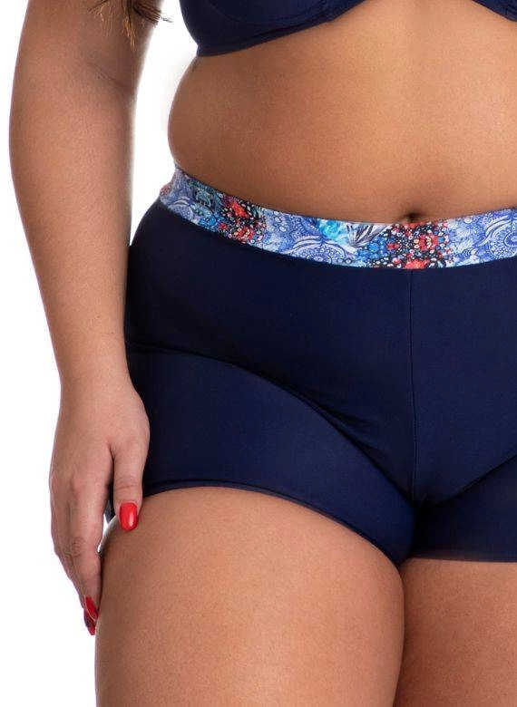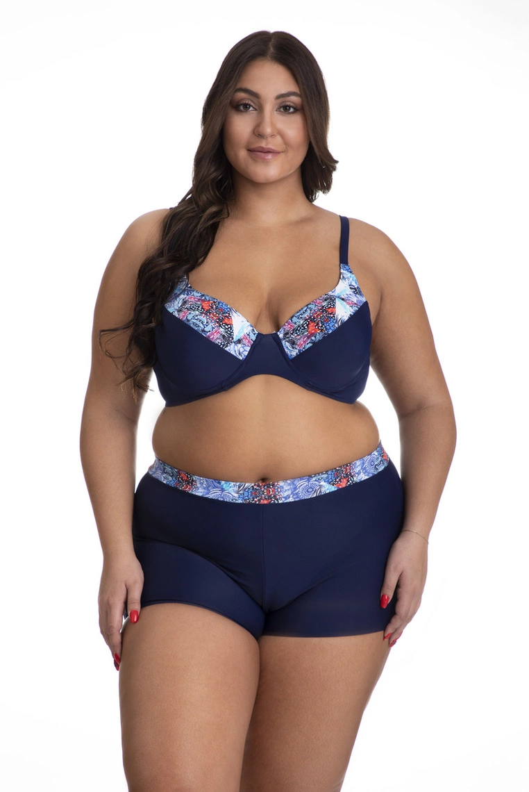 W komplecie Susanna klasyczne figi zostały zastąpione szortami, które nawiązują do stylistyki retro. Ozdobna lamówka, którą wykończono górną ich krawędź ładnie koresponduje z wzorem na miseczkach stanika. Przednia część szortów została wyściełana miękką podszewką, a całość uszyta jest z jakościowego, elastycznego materiału zawierającego włókna oryginalnej Lycry. Dobry skład materiałowy (80% poliamid, 20% elastan) sprawi, że Twoja skóra będzie bezpieczna nawet podczas długich godzin spędzonych nad wodą. Polski producent mody plażowej Primo oferuje ten model kostiumu w rozmiarach do 5XL.