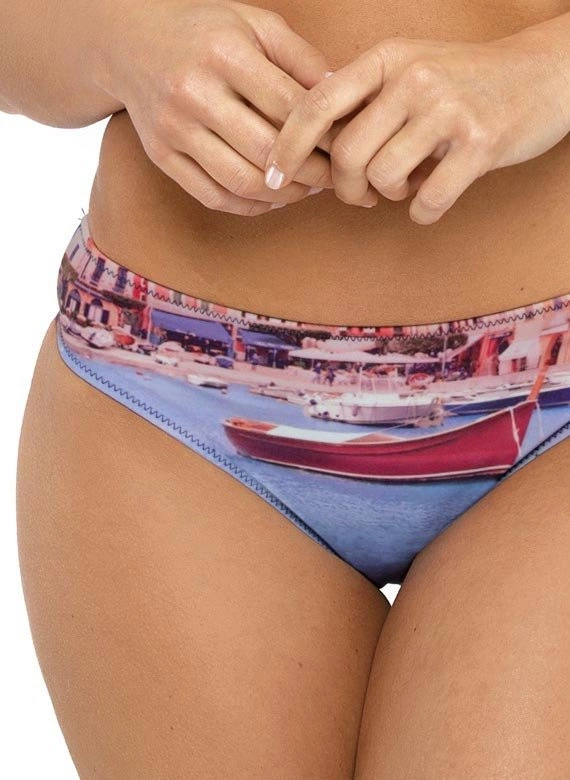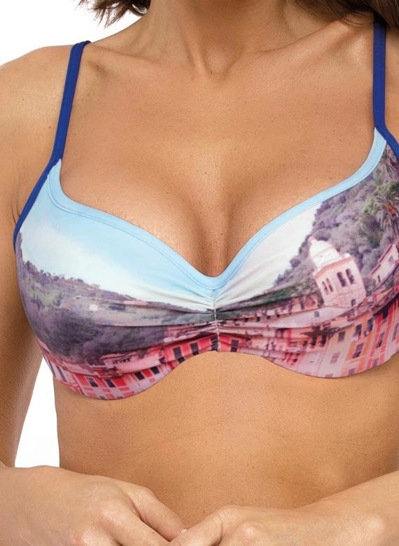 Ciekawy, dwuczęściowy kostium kąpielowy uszyty z włoskiej, wzorzystej tkaniny. Z nadrukiem pejzażu. Świetnie odróżnia się od klasycznych, gładkich modeli, prezentuje się elegancko i kobieco.