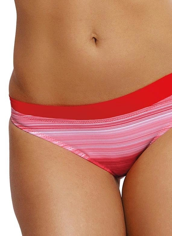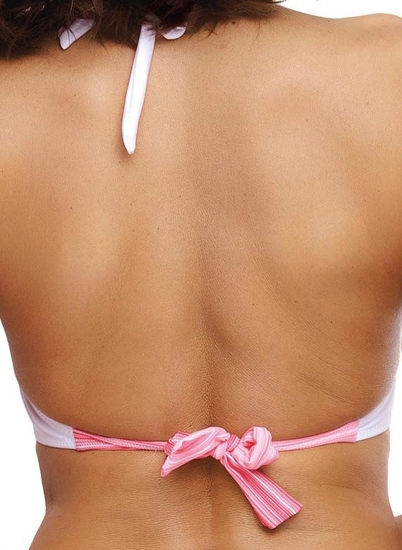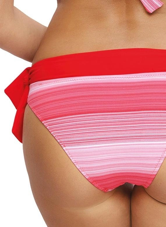 Biustonosz z trójkątnymi miseczkami usztywnianymi specjalną pianką, wzbogacony push-up-em - dzięki niemu piersi uniosą się i optycznie powiększą, tworząc zmysłowy, głęboki dekolt. Push-up umieszczony jest w kostiumie na stałe i nie jest wyjmowany z modelu, występuje w każdym rozmiarze kostiumu. Biustonosz zwraca także uwagę modnym dodatkiem w postaci "pasków-gumek" umieszczonych przy dekolcie. Ładne ramiączka wiązane na szyi, zdobione delikatną, biżuteryjną ozdobą (można ją zdjąć), będą atrakcyjnie prezentować się w promieniach słońca.  Majteczki o doskonałym kroju "midi" - o wyśrodkowanej wysokości. Są wzorzyste i ozdobnie wiązane na boku (klasyczny, wkładany krój). Skład: 80% poliamid, 20% elastan.